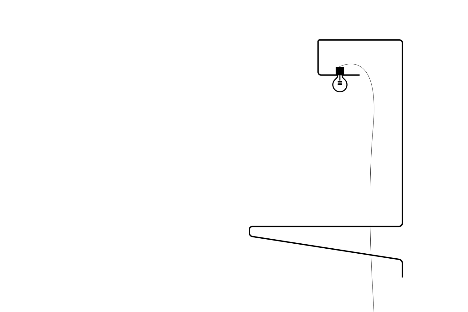 LIN is a desk made out of a 3 mm single bended steel sheet. Its form creates an inertia able to react to the weight of the desk and its user. The sheet extends itself to become a table lamp. LIN is fixed to a wall through screws, freeing the lower part of the desk. LIN is powder coated within the LI referenced colors.