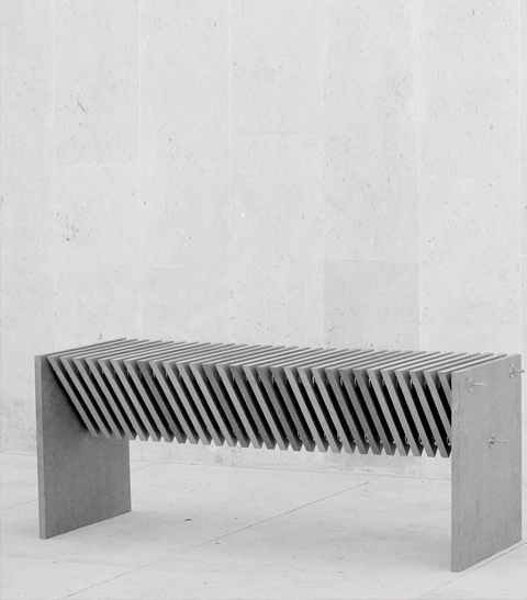 ALI PRESTRESSED BENCH is composed by the repetition of a single wooden or stone element. The simple triangular elements composing the shape of the bench are put together through three horizental prestressed steel rodes. They increase the capacity of the bench to resist to compression. The bench using stone can be used as an urban element, on public spaces. It perfeclty fits into exhibition spaces, waiting areas, or lobbys with the solid wood material option.
